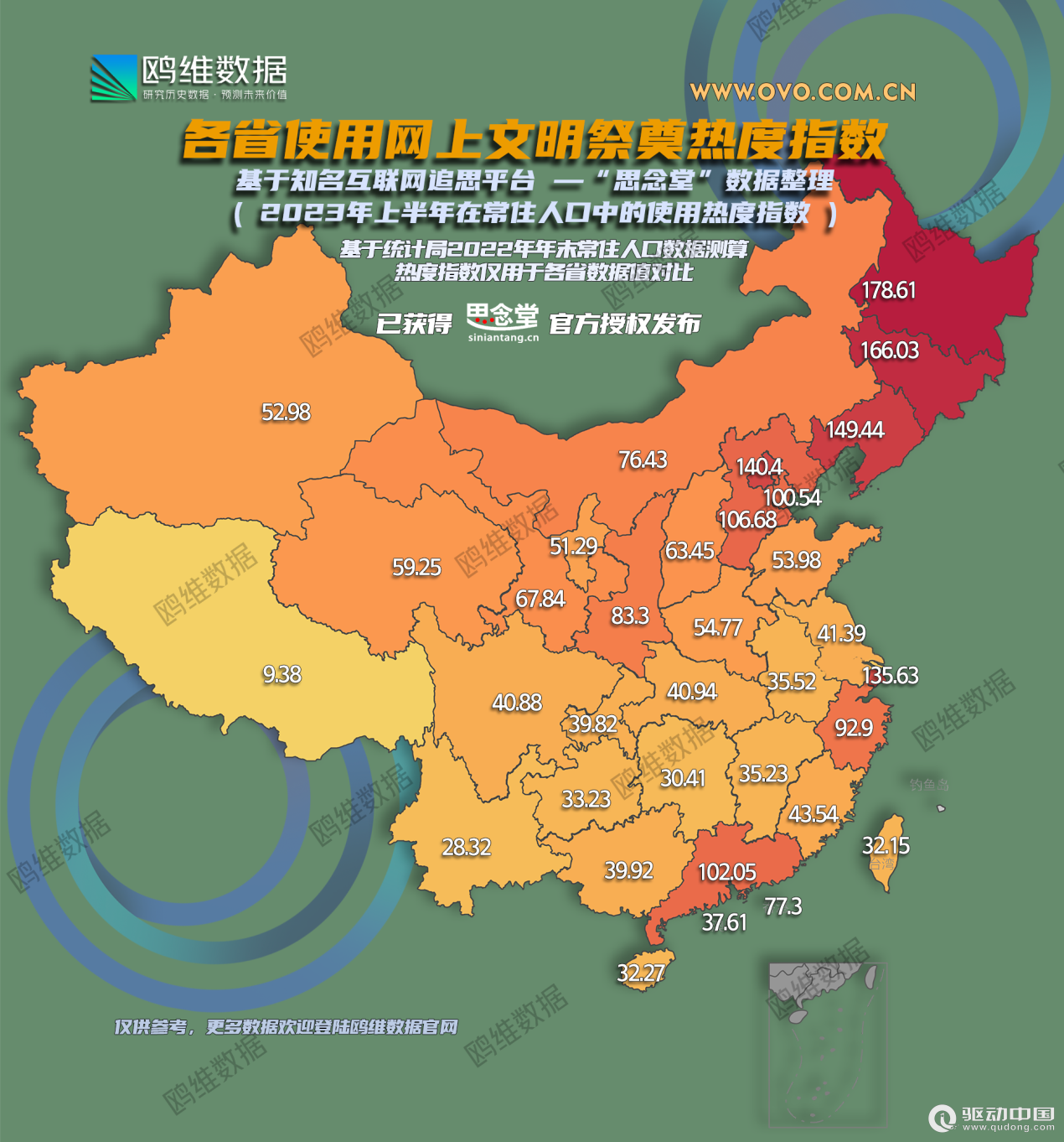 作为中国重要的传统节日之一,中元节承载着人们对逝去亲人的深深思念和无尽哀思。然而,在当下的数字化时代中,追思方式也随之不断发生着变化和演进。日前,由知名网上祭奠平台思念堂联合行业权威数据平台鸥维数据发布了“全国网络祭祀热度指数”。通过大数据分析,揭示了上半年全国各省常住人口中使用网络平台进行追祭的占比情况,也为我们了解当代社会的追思方式带来了全新的视角。